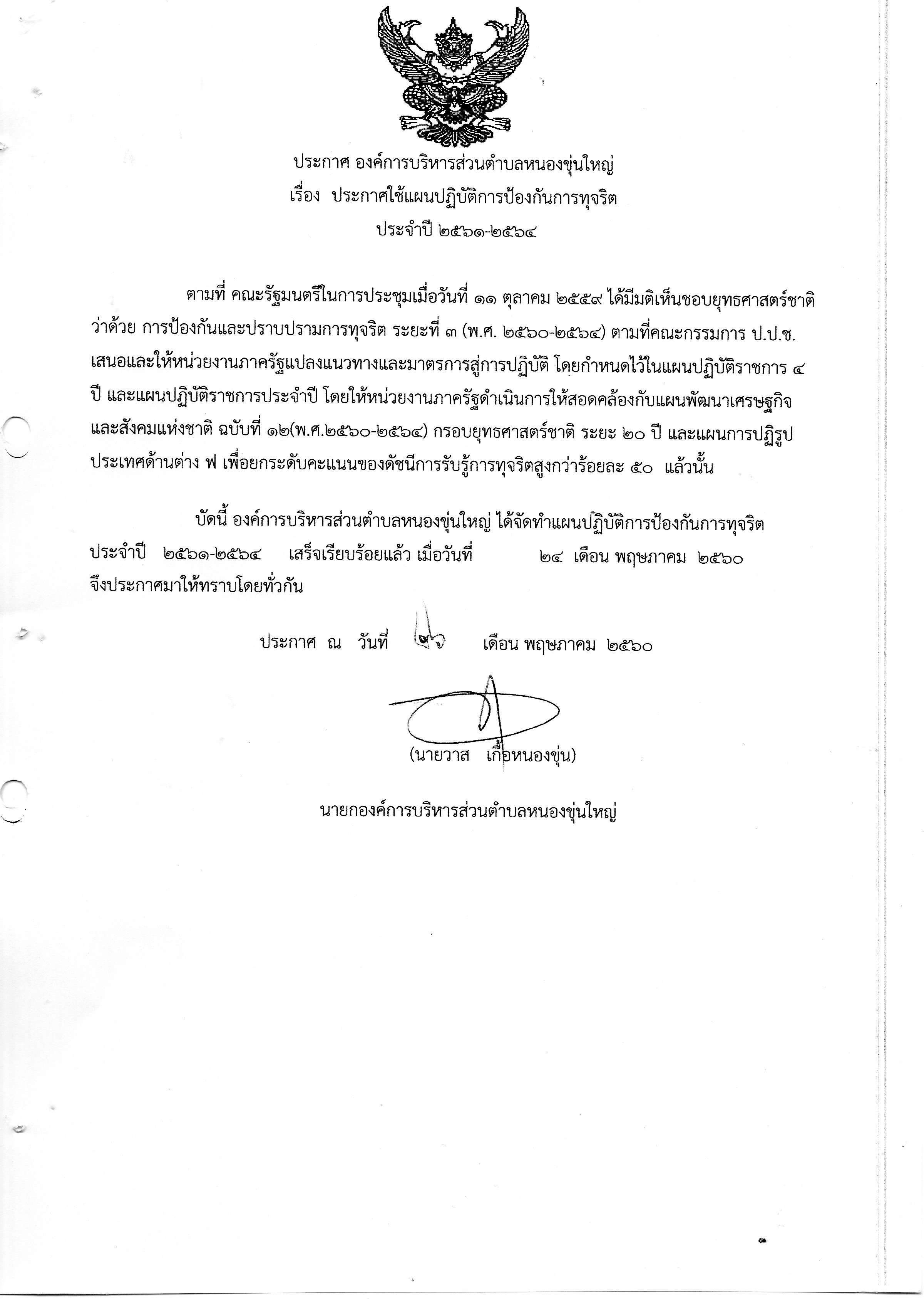 ประกาศใช้แผนปฎิบัติการป้องกันการทุจริตประจำปี 2561-2564