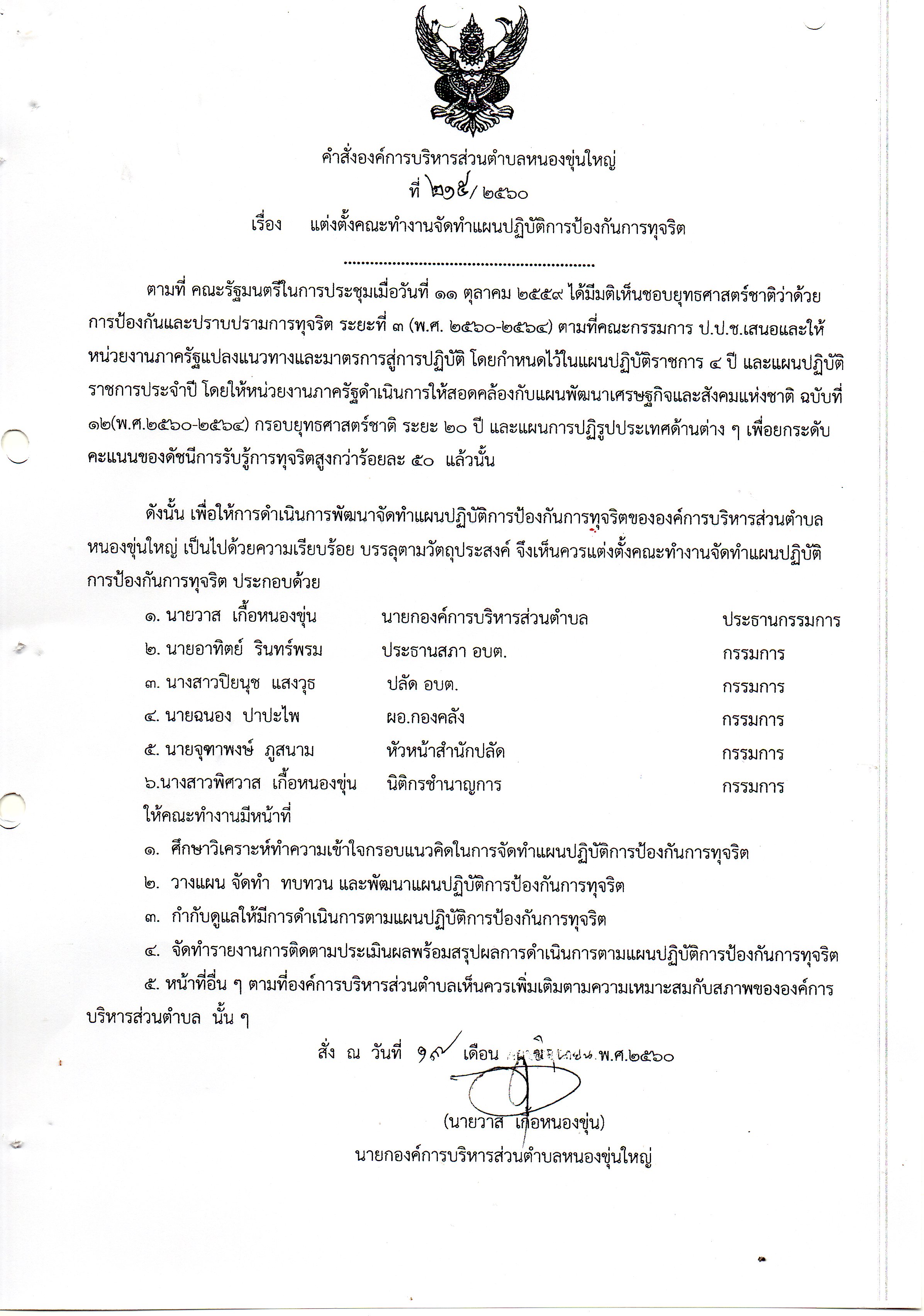 แต่งตั้งคณะทำงานจัดทำแผนปฏิบัติการป้องกันการทุจริต